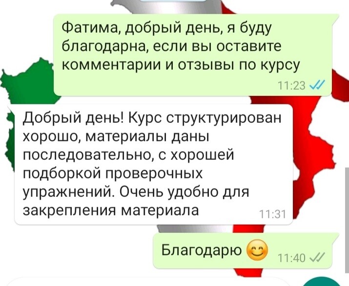 Очень нравится педагог. У меня есть улучшения. Мне нравятся её методы работы. Берём разные аспекты, разговорный, грамматику, аудирование. На занятиях разговариваем только на итальянском.